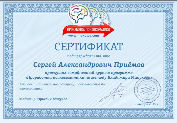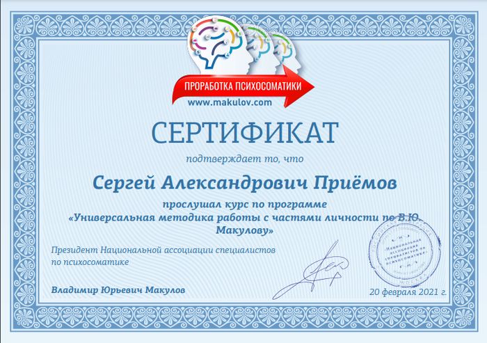 В 2020г. прошел обучение по гипнотерапии и гипнозу на швейцарском курсе OMNI, сертифицированном по стандарту ISO 9001, с присвоением статуса сертифицированный гипнотерапевт.